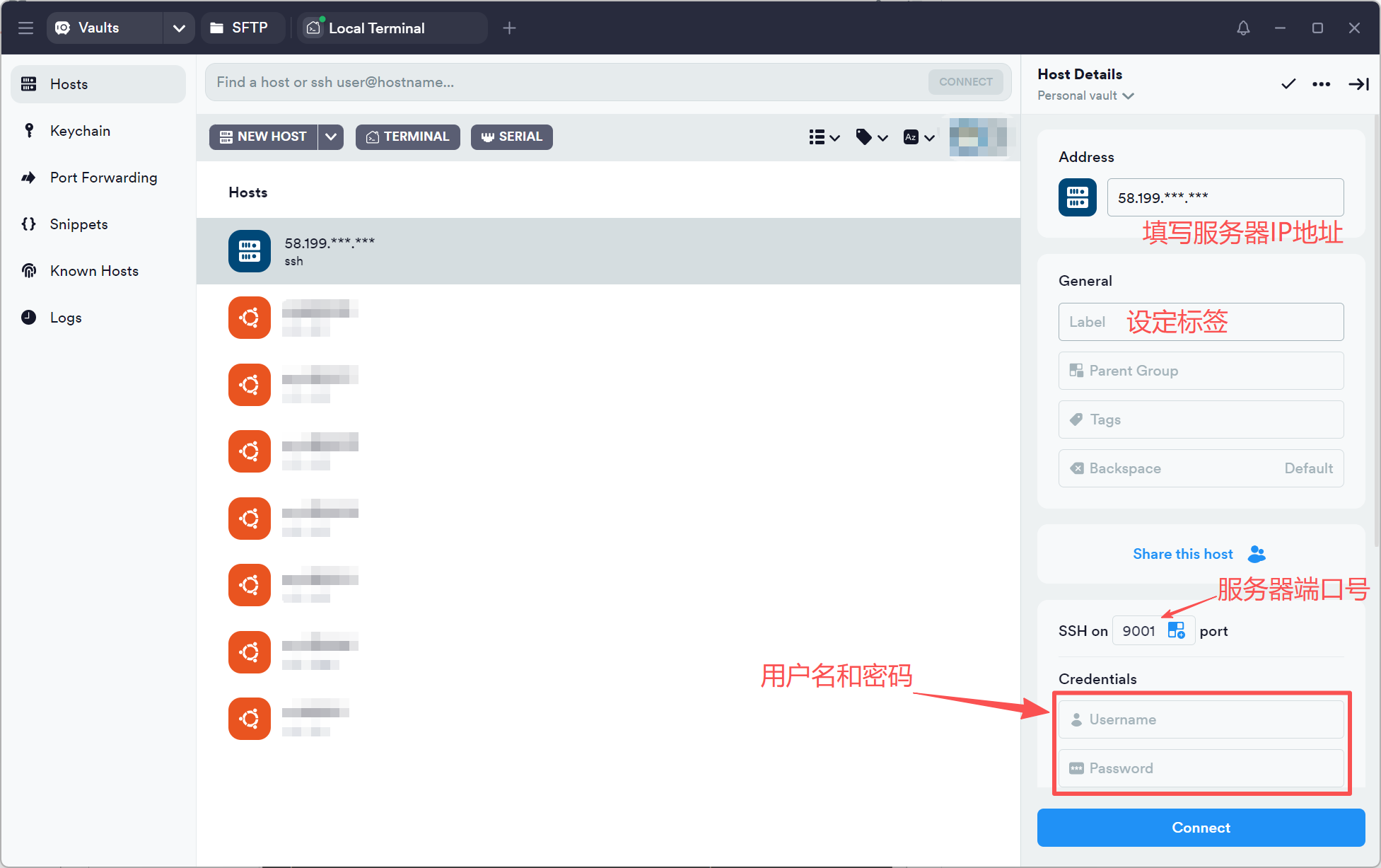 在右侧选项卡分别填入服务器 IP 地址、端口号、用户名密码等信息,最后点击 connect。