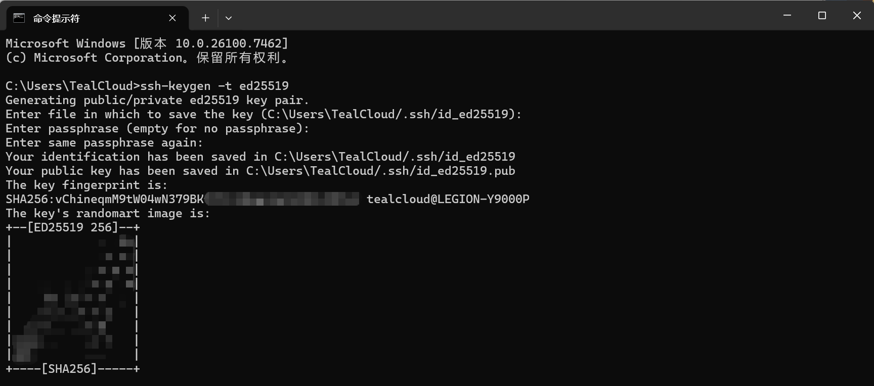 随后一路回车(无需设置密码),直到出现矩形的密钥指纹图。