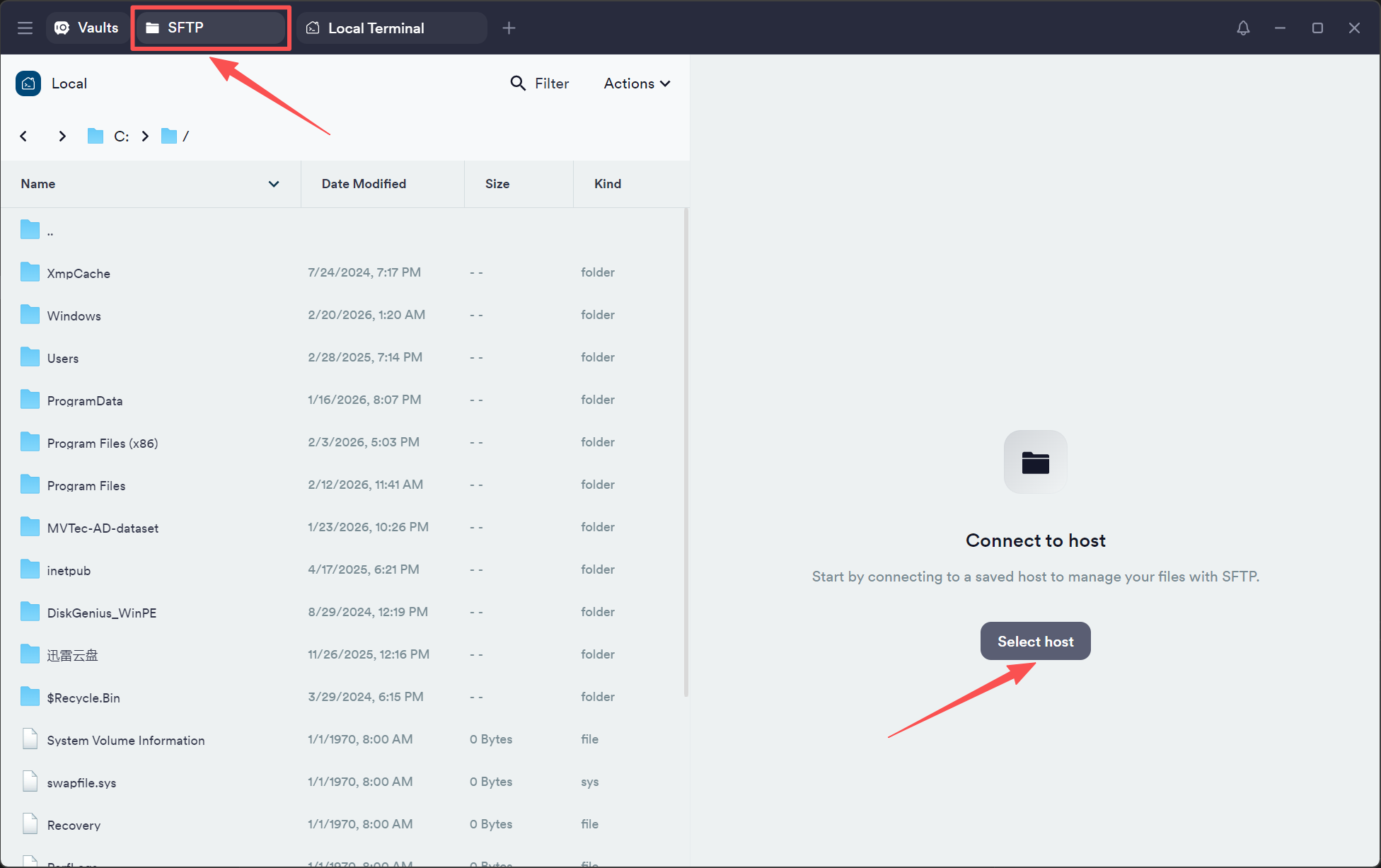 点击左上角的 SFTP,这个界面是用于文件传输的,负责文件上传至服务器和下载至本地。