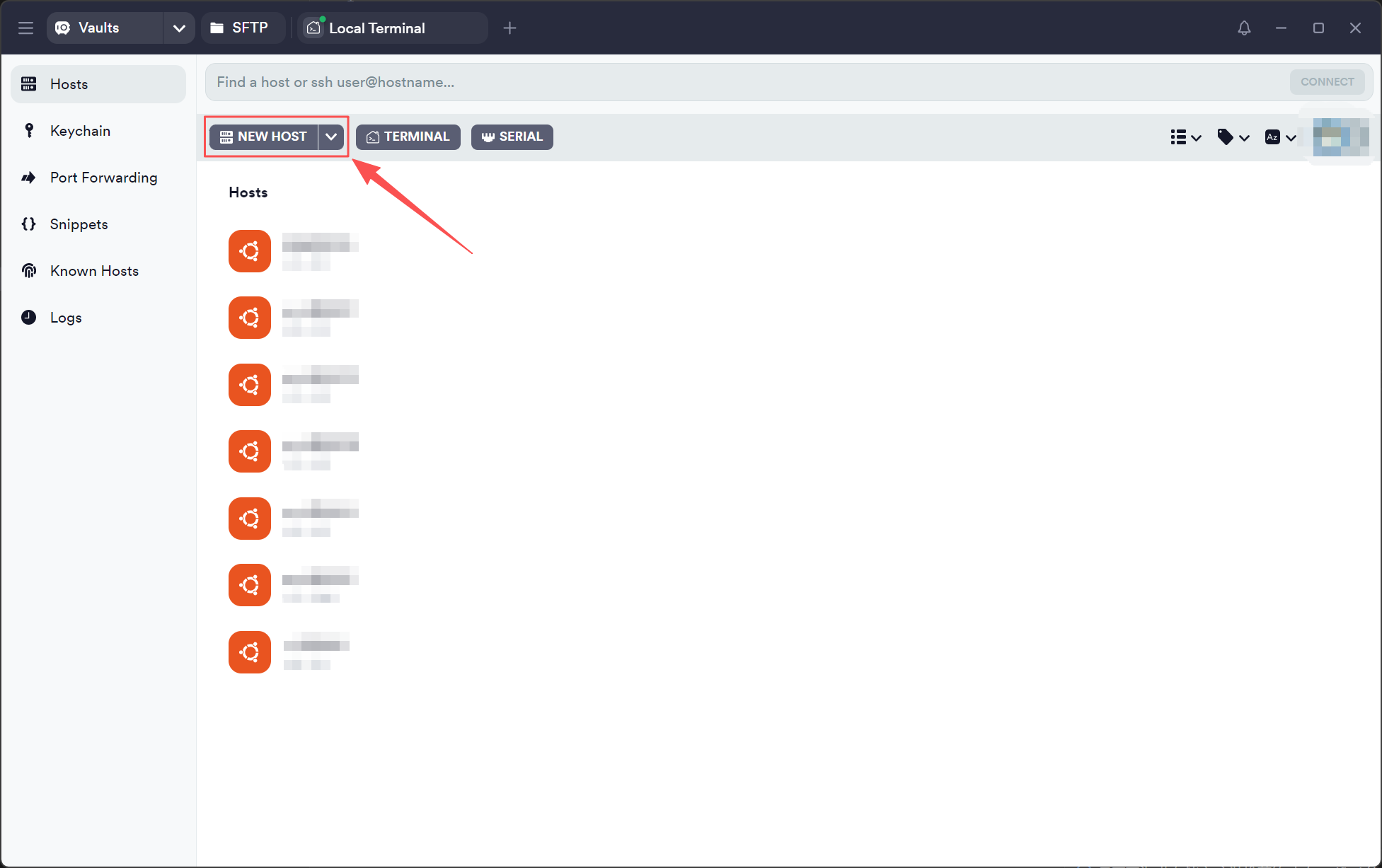 打开 Termius,点击左上角的 NEW HOST 图标创建一个新会话。