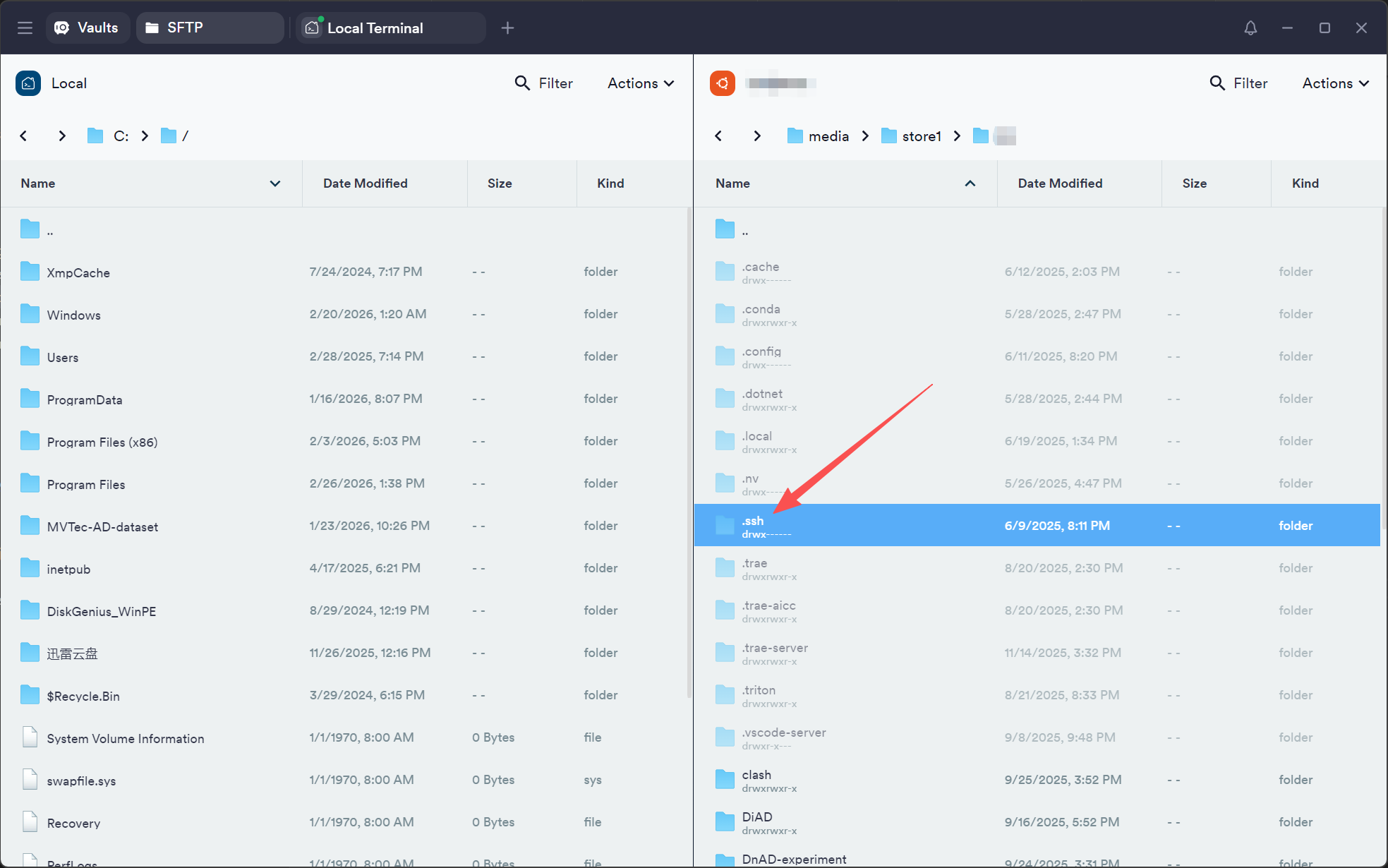 使用 Termius 连接至服务器,进入用户根目录下的.ssh文件夹(如果没有该文件夹,请右上角开启 Show Hidden Files 或手动创建)。