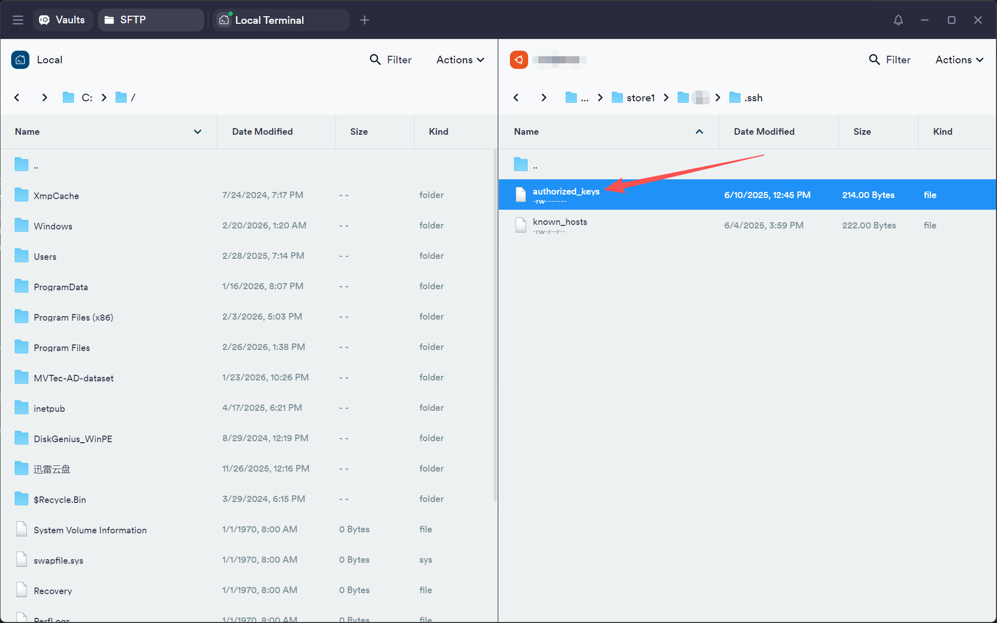 .ssh文件夹下是否存在authorized_keys文件。 - 如果有:直接打开,将第 2 步复制的公钥内容追加粘贴到文件末尾。