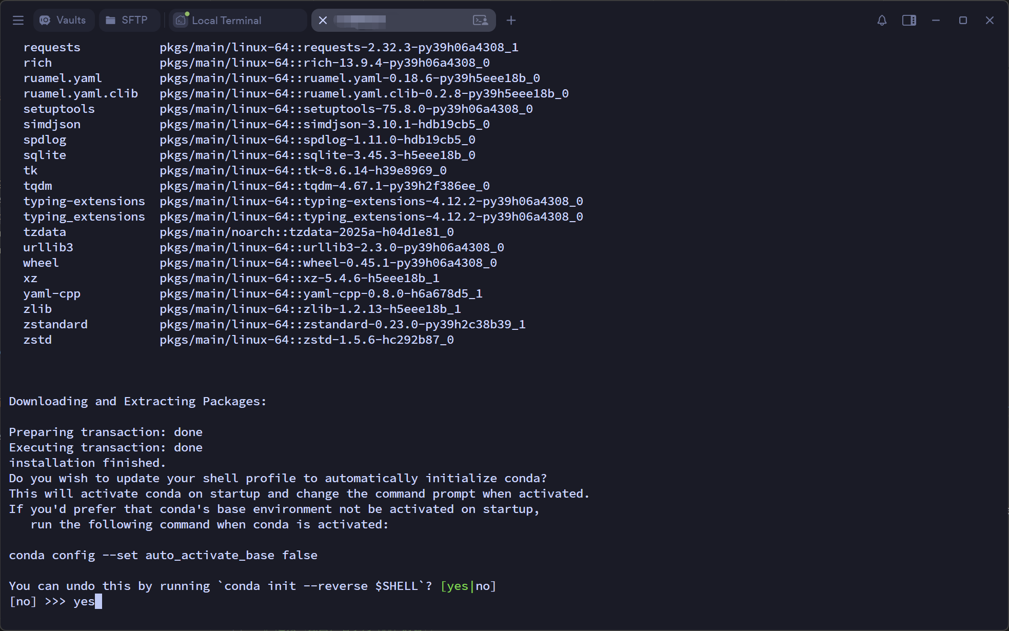 继续根据提示操作,当询问是否自动启动 conda (Do you wish to update your shell profile to automatically initialize conda?) 时,一定要输入 yes!