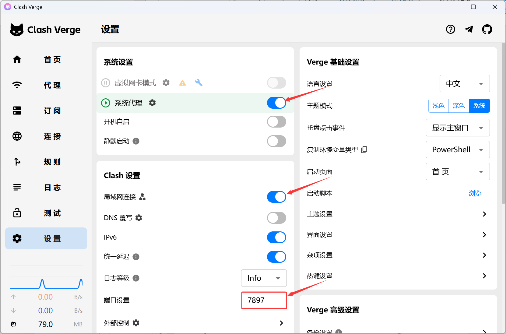 在本地电脑中打开 Clash Verge Rev,确保打开系统代理,允许局域网连接,并记下端口设置中的端口号(此处示例为 7897,后面会用到)。
