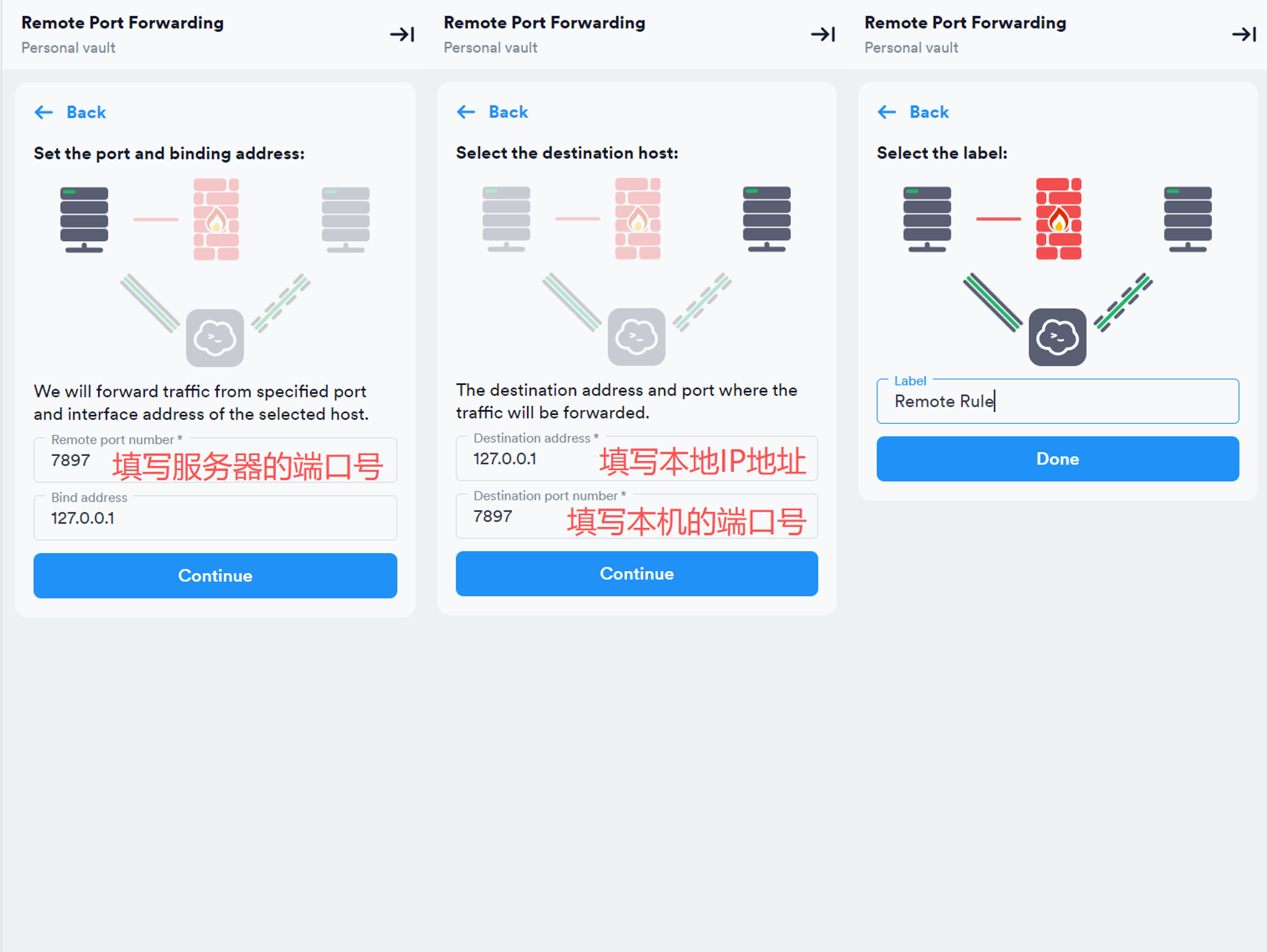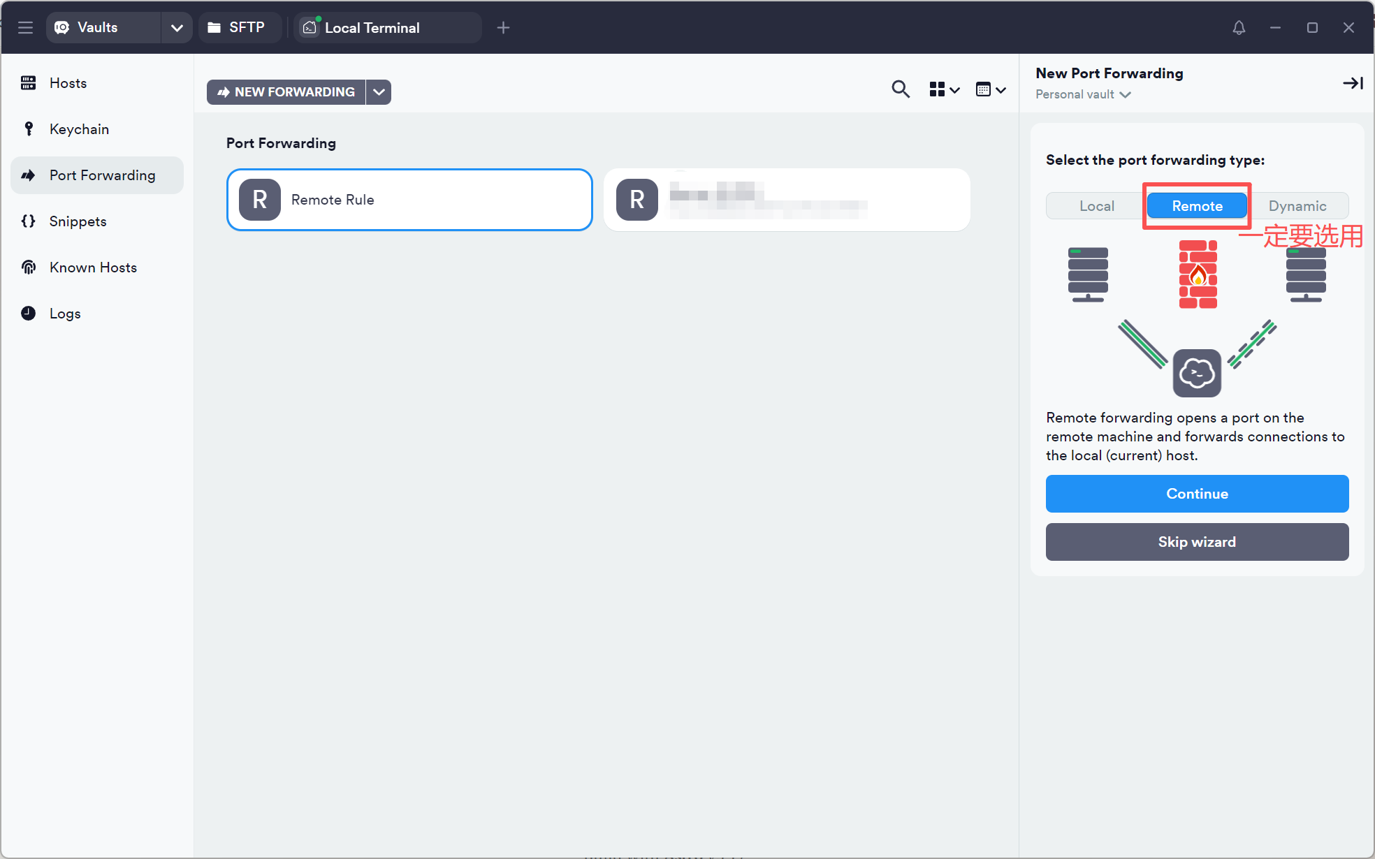在右侧的配置栏中,选用 Remote,用于将远程的端口在本地转发,随后点击 Continue。