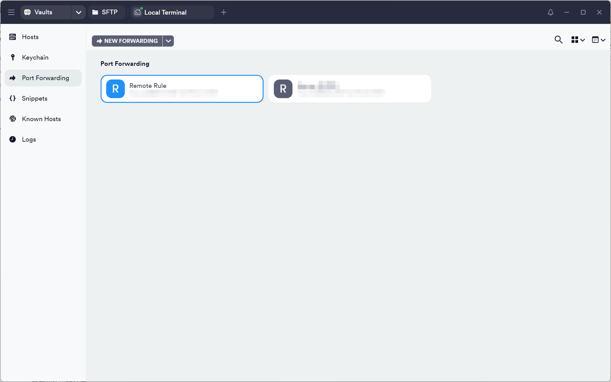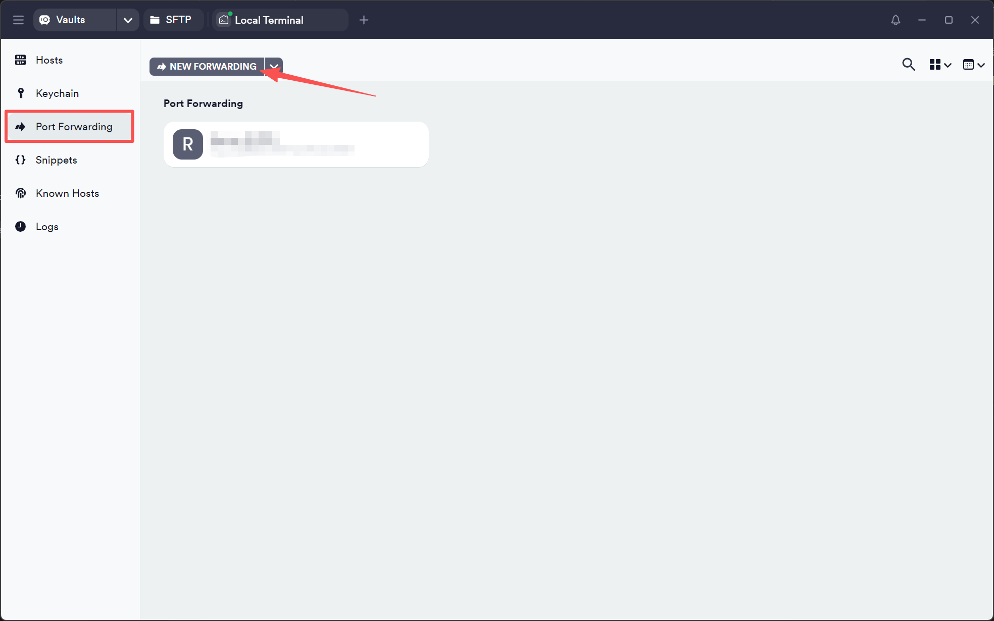 在本地电脑中打开 Termius,点击左侧的 Port Forwarding,随后选择 New Forwarding 来新建一个端口转发。