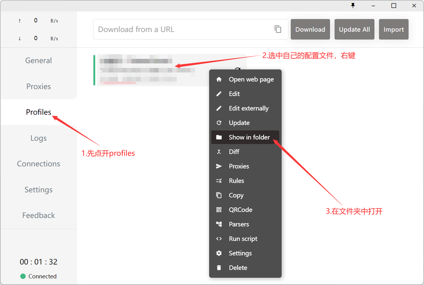 在本地电脑中打开 Clash 代理软件(如 Clash for Windows),右键点击你当前使用的配置文件 -> Show in folder。