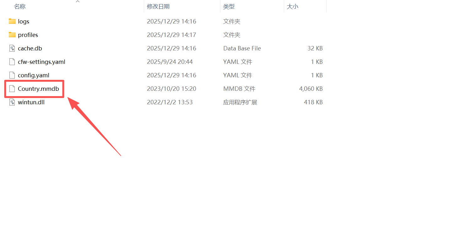 .yml文件 (通常是一串数字命名,不同 Clash 软件的名称不同,可以参考下方图片中的内容以确定) 和Country.mmdb(在.yml文件的上一级目录下)文件。